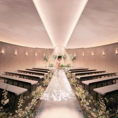 【感謝を伝える感動の挙式体験】温かみのあるナチュラルなデザインと、柔らかな光が花嫁を優しく包み込む。円を描く天井や壁面の照明など、自然とふたりへ視線が集まるよう工夫がほどこされた全天候型のチャペル。