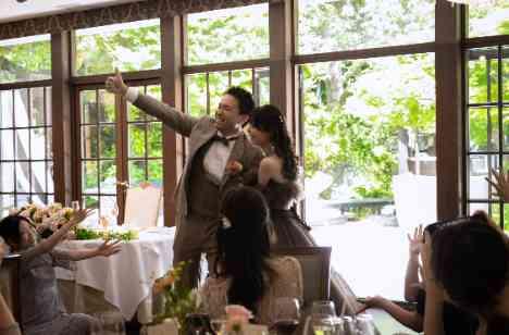 再入場のシーンではご友人様にもご協力いただき、ダンスを披露♪全員を巻き込んでダンス!手拍子!と大盛り上がりのシーンに。ガーデンの緑を背景に、一体感溢れる披露宴会場を一望し、新郎新婦のお二人から最高の笑顔がこぼれます。お手伝い頂いたゲストとの写真撮影も大盛り上がり。ガーデンを背景に皆様の最高の笑顔が溢れました。