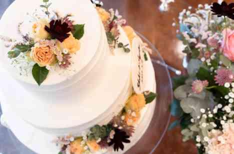 会場のコーディネートに合わせ、ナチュラルな雰囲気で作成したオリジナルウェディングケーキ。プランナー・パティシエと相談しながらデザインし、シンプルな中にもこだわりのお花の配置やプレートで、世界に一つだけのケーキが誕生しました。ケーキ入刀の際は、ゲストもたくさんお写真撮影をいただき、大好評!お二人も満面の笑みでお答えいただきました。
