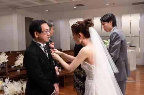 挙式の前には、晴れ姿を一番最初に見ていただくため、親御様とのファーストミートセレモニーを実施。お父様の胸元へ、新郎新婦様ご自身でブートニアを付けて差し上げるセレモニーには、お父様だけではなくお母様の目にも思わず涙があふれるシーンとなりました。感謝の気持ちの伝え方はたくさんありますが、敢えてゲストの前でではなく、ご家族様だけの空間でお伝えするからこそ本音が伝えられるシーンです。