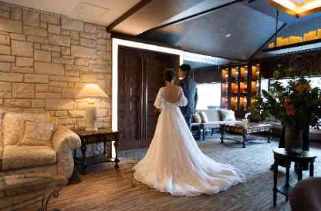 お二人のお選びいただいた披露宴会場「ベルエアスイート」は、高級ホテルの最上階にあるスイートルームをイメージした造り。ご入場前のひと時も専用ラウンジでゆったりとお写真撮影の後、ボリュームあるドレスも美しく広げてご入場。ワンフロア貸切のプライベート空間ならではの、ゆったりとした1日を過ごしていただけます。