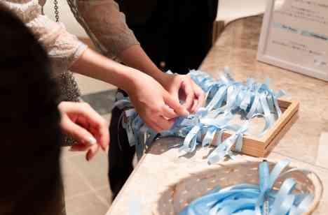 挙式はオリジナル「人前式」昔から「青いものを身に着けると幸せな花嫁になれる」という言い伝えがある「サムシングブルー」。お二人はリボンを結んで大切な結婚証明書の完成。テーマに沿った大変素敵なシーンとなりました。人前式ではお二人らしい証明書が人気。感動的な挙式、笑顔が生まれるさわやかな挙式、すてきな時間になりますように。