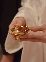 小盃は”お2人のご縁をご先祖様に感謝する ”中盃は”お2人で末永く力を合わせて生きていく ”大盃は”両家ご家族の幸せを願う”という意味が込められています。 はじめの2回は盃を傾けるのみ、3回目で飲みほしていただき両家の繁栄を祈るセレモニー。