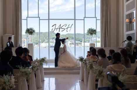 長崎湾を一望できるチャペルのガラス張りにはテーマの「JASH」の文字を貼りました。誓いの言葉は友人の方に考えて頂きました。新婦側のご友人様はコロナの影響でお越しいただくことが出来なかったので、オンラインで繋げて誓いの言葉をお話し頂きました。また、結婚証明書はオリジナルデザインで、ゲストからのメッセージを集め、タイムカプセルの様に瓶に入れて頂きました。