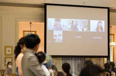 コロナ禍で結婚式に参加出来なかったゲストの為にオンライン参加という新しい結婚式の形を行いました。実は親友たちにブライズメイドをお願いしていた新婦様。本当はお色直し入場を一緒に行う予定でした。しかし、コロナの影響で来られなくなりました。サプライズでお色直し入場時にサプライズでブライズメイドのメンバーがスクリーンに上映され驚くお二人。預かった手紙を司会者が代読し、感動的な忘れられない時間となりました。