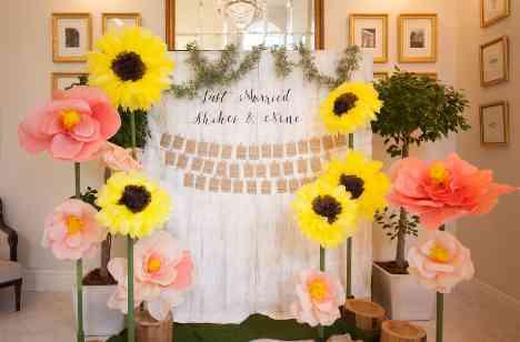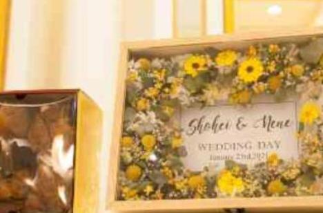 お2人の大好きなヒマワリを使用し、ロビーにてフォトスポットを創りました。ゲストの皆様にも挙式前の待ち時間に楽しんで頂き、思い出のお写真を増やして頂き、笑顔溢れる時間となりました。 1月の結婚式でしたが、お2人の大好きなヒマワリのように見立てたフォトスポットを設けて温かい素敵な空間を創っていきました。