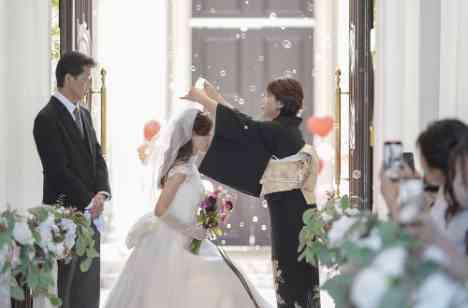 可愛らしい雰囲気がお好きでしたので入場時に幻想的なバブルマシーンを使用してご入場して頂いております。 また、中庭にはお2人こだわりのハートのバルーンも見えてよりお二人らしさを表現出来ております。 挙式と披露宴でメリハリを付けたいご希望でしたので 挙式の中ではベールダウンとエスコードのみ親御様に行って頂き感動的な時間を過ごしt頂きました