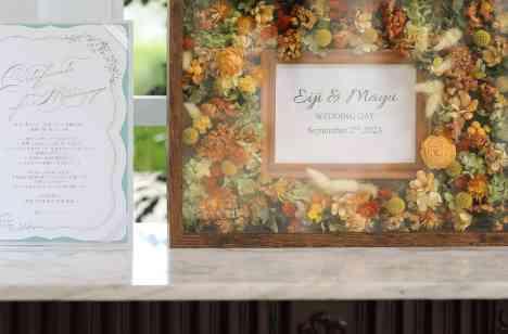 ゲストとワイワイ一緒に過ごしたいというイメージがあったお二人。 ドライフラワーが好きなご新婦様は結婚証明書からこだわってくださいました。 フラワーボックスにすることでロビーでゲストの皆様も一緒に作ることができ、世界に一つの結婚証明書が完成しました。 ご結婚式後も大切な方々との宝物になりました。
