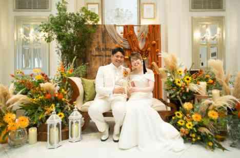 メインのお席はゲストとワイワイ盛り上がりたいお二人にピッタリなソファ席をご提案しました。 お花のお色味は暖色系でまとめてほがらかなお人柄にもとてもマッチしておりました。 当日はゲストの皆様もお二人の横に座って沢山お話しされる温かな空間となりました。また、全身見えるのでお写真映えもばっちりでした。