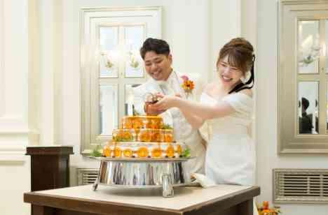 他とは被らないことがやりたい!そんなお洒落なお二人だからこそ、ケーキ入刀の代わりにカラードリップを行い、お二人だけのウェディングケーキを完成させていただきました。 定番の演出ももちろんいいですが、珍しい演出でゲストも盛り上がりました。この後デザートブッフェとともに皆様でお召し上がりいただきました。