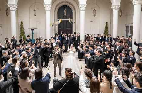 お酒が大好きなお二人だからこそ、挙式の後に一足先に乾杯のお時間を作りました!乾杯のご発声はご新郎様ご自身で行っていただき、「かんぱーい!」と同時に新郎新婦様の周りにはゲストの皆様が集まってくださる笑顔溢れる瞬間になりました。 ゲストの皆様にも「こんな結婚式はじめて!」と言っていただけるほど楽しんでいただけました!