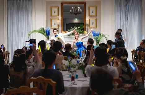 披露宴の中でも特に盛り上がりが大事なのがご入場の時間。今回のカラードレスでのご入場はドレスの色当てクイズも兼ねたペンライトで皆様に盛り上げていただきました! 更に、新郎新婦様はガーデンからのサプライズ入場後に曲に合わせてダンスを行い、ゲストの皆様も新郎新婦様にカメラを向けて「かわいい!」と大好評でした。