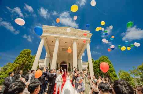 挙式の後には大階段を使用してバルーンリリースを行いました。バルーンの色もお二人に選んでいただいたカラフルな組み合わせで、新郎新婦様も一番楽しみにしていた演出でした。当日、バルーンに全員の願いを乗せて青空に届ける瞬間は、写真映えも抜群でゲストの皆様からも歓声が上がって大盛り上がりのお時間となりました。
