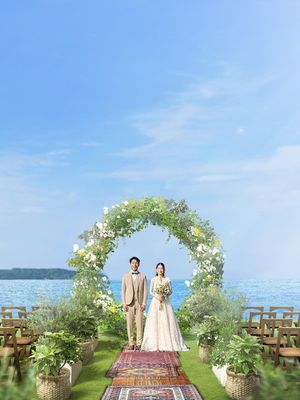 長崎唯一!180度オーシャンビューと青い空に包まれたガーデンチャペル。明るい自然光は、お二人の姿を美しく引き立たせます。