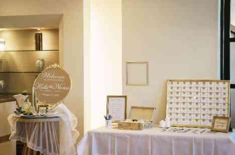 会場に到着して一番にゲストをお出迎えするウェルカムスペース。オリジナルデザインのミラーやエスコードカード等細部までこだわって世界観を創り上げました。エスコードカードの隣にはワインBOXをご用意しておふたりに宛てたメッセージをゲストがしたためたカードを入れてもらいました。タイムカプセルのように保管して喧嘩してどうしようもなくなった時に開けるんですとおふたり。