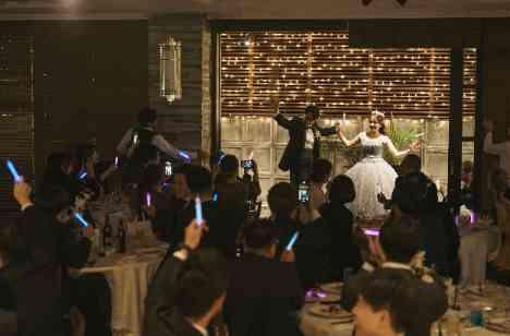 ゲストの前でお肉を焼き上げるライブキッチン演出や、ワインBOXセレモニー等ゲストが楽しめるコンテンツをたくさんご用意したおふたり。最大のこだわりは再入場。カラードレスの色あてゲームをサイリウムを選ぶことで行って頂き、再入場の直前で点灯。真っ暗な会場にサイリウムが映える中、大きな窓から新郎新婦再入場!からのダンス披露と大盛り上がりな会場内。一体感が醸成されて全員が盛り上がる空間が出来上がりました。