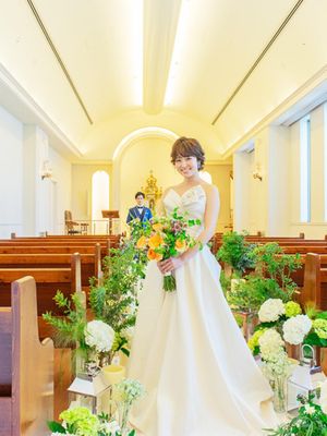 オーダーメイドのステンドグラス。天窓から降り注ぐ柔らかな自然光がおふたりを優しく照らし、ドレス姿を息を呑むほど美しく輝かせます