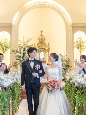 高い天井に反響するパイプオルガンの調べ、バイオリンの旋律、そして聖歌隊の透き通る歌声。その圧倒的な音響効果は、まるで劇場にいるかのような没入感を生み出します。おふたりの一歩一歩に寄り添うように奏でられる音楽が、セレモニーをよりドラマティックに彩り、参列するゲストの心にも深い感動を刻みます。