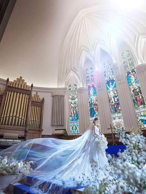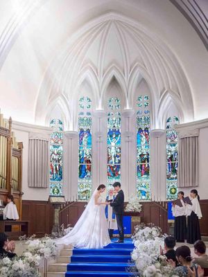 20mも続く気高いロイヤルブルーのバージンロードが魅力的。自然光が差し込んだ堂内には、英国の由緒正しいイマニエル教会で120年以上愛され続けたステンドグラス。