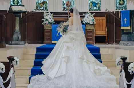チャペルは一目惚れでした。高い天井と大きなステンドグラス、パイプオルガンや木のベンチなどヨーロッパの大聖堂のようなチャペルです。中でも青いバージンロードは白いドレスとの相性が良く写真映えも最高でした。ゲストからもすごく評判が良かったです。式場カメラマンによる写真撮影を申し込んでおくと式前にこのような写真を撮ってもらうことができます。