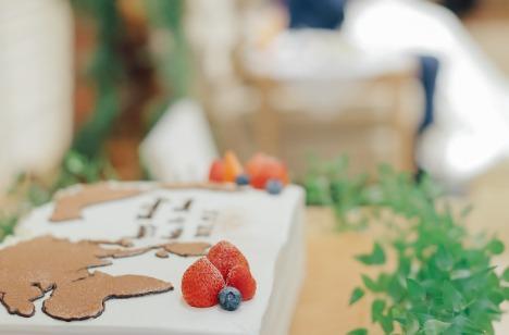 ウェディングケーキは自分たちでデザインを考えるオリジナルケーキでした。お互い旅行が好きなので一緒に世界を旅しようという思いを込めて世界地図を模したケーキを作ってもらいました。披露宴会場がソファー席だったのでテーブルがない分、ゲストとの距離が近かったり、ドレス全体を見てもらうことができて良かったです。