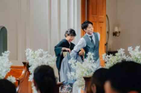 お二人の人生を表しているといわれるバージンロード。大切に育ててくださった親御様に感謝を伝えたい。 そんな想いを込めて実施された『ジャケットセレモニー』 バージンロードをエスコートされるご新婦様のご家族だけでなく、ご新郎のご家族にもお役目をお願いしました。 お二人の親御様にとっても大切な節目となる挙式になりました。