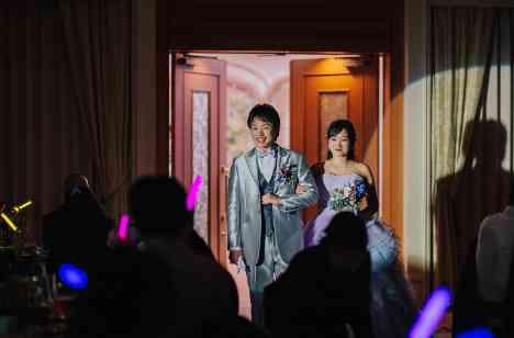 披露宴のはじめはガーデンでの『ウエルカムパーティ』でお二人がゲストをお出迎え。 ここでお二人からゲストに向けてペンライトが配られました!パーティで何が始まるんだ ろう?!とゲストはワクワクしながらパーティがスタート。 ペンライトはご新婦のお色直しのドレス色当てクイズで使用され、お二人再入場のシーン が一気に盛り上がりました!!