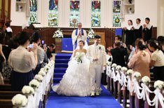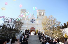 イギリス伝統のステンドグラスに彩られたチャペルで、夫婦になるための誓いを行った新郎新婦。まるで天から降ってくるような美しさの聖歌隊の歌声と、たくさんのゲストの笑顔溢れる祝福に包まれながらロイヤルブルーのバージンロードを歩いていきます。荘厳な空間での挙式の後は、カリヲンの鐘が鳴り響く空の下でのバルーンリリース。天気にも恵まれ、快晴の中ゲストとみんなでバルーンリリースを行いました。