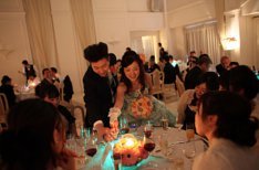 お色直し後はミントグリーンの光で各卓を演出し、ゲストのみなさまも「キレイ!」と大喜び。そして、大好きなハリーポッターをイメージして新婦が杖をふると…!なんと、メインテーブルのキャンドルが点火!!イリュージョンのような演出に会場も盛り上がりました。更にバレンタインも近いということでサプライズで新婦からチョコのプレゼントをすると、新郎からは真っ赤なバラの花束が!サプライズのお返しに新婦も大感激でした。