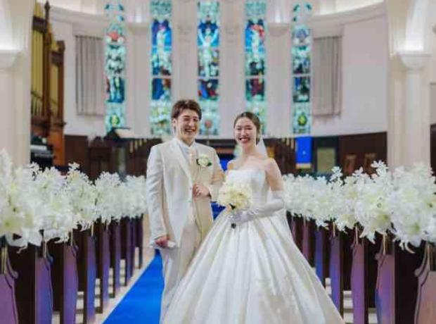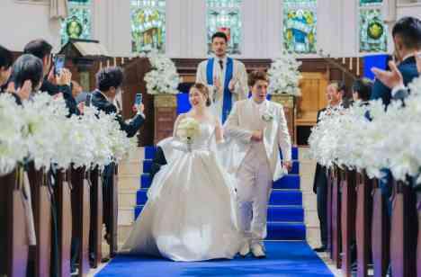 アニヴェルセル ヒルズ横浜のチャペルは、ブルーのバージンロードと美しいステンドグラスが魅力。おふたりもここを歩けたら素敵だなと思ったことが式場選びの決め手となったそう。100名程のご招待客でも十分な広さがあるため、余裕をもって着席いただけました。挙式中はサプライズリングボックスの演出で盛り上がり、当日はお天気にも恵まれたため、屋外の大階段でバルーンリリースやフラワーシャワーも楽しまれていました。