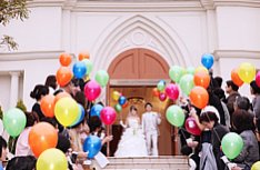 伝統を受け継ぐステンドグラスに見守られながら、温かなセレモニーが始まります。 歴史を受け継いだ幻想的な空間で、永遠の愛を誓うおふたり。 挙式後、扉を開けるとチャペルへと続く大階段でのバルーンリリースが始まります。 こちらはご新婦様が一目惚れした演出。 カラフルなトロピカルカラーが鮮やかで、印象的なひと時となりました。