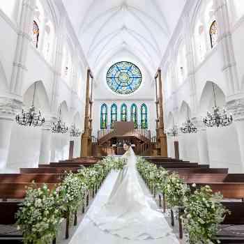 真っ白い空間に輝く、ブルーのステンドグラスが際立つ大聖堂。感動的な挙式後は、天窓から自然光がたっぷり降り注ぐ開放的な大階段でフラワーシャワーの祝福を