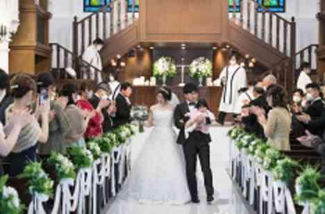 繊細な輝きを放つステンドグラスに魅了されるチャペルでの挙式。響き渡るパイプオルガンの音色と聖歌隊の歌声に包まれて夢心地。「クリスマスのムードに合う曲をリクエスト。2階から入場できる珍しい造りなので、長くバージンロードを歩けて幸せでした」。子どもを挟んでのウエディングキスをする心温まるシーンでゲストも笑顔に。