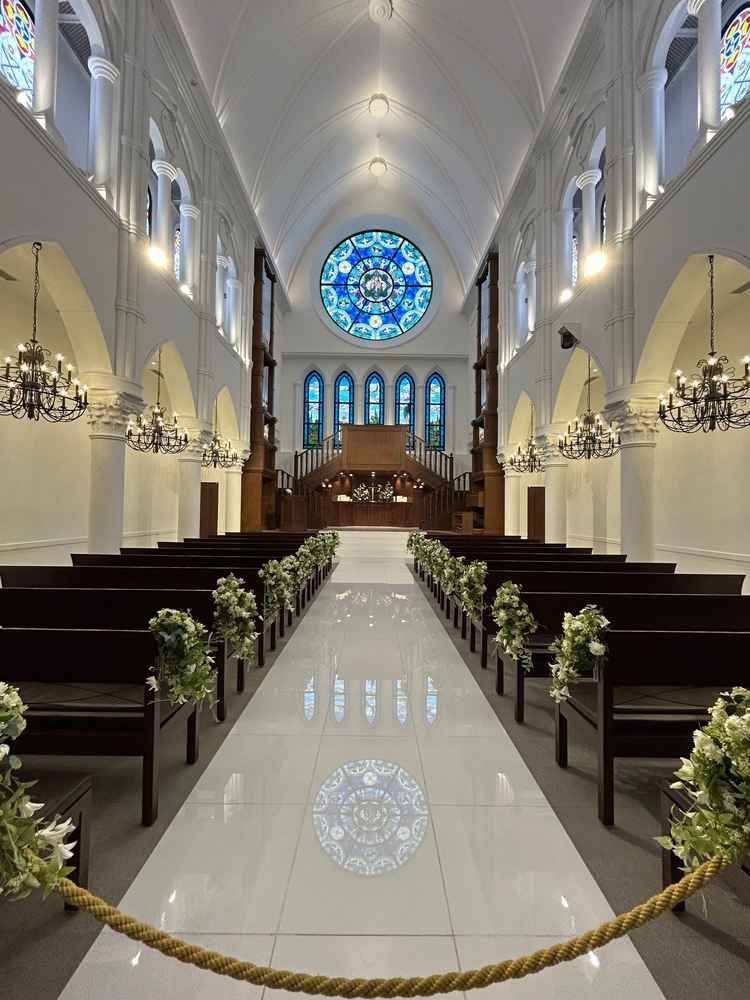 白基調に青色のステンドグラスの大聖堂が綺麗。2階からの挙式入場が可能なことが珍しく面白い。天井が高くて広く感じる。