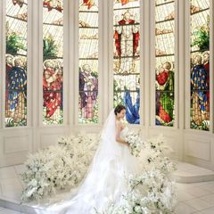 【花嫁を1番綺麗に魅せる設計がされた大聖堂】28Mの天井高から自然光が入り、花嫁を明るく輝かせるチャペル。1800年代のヨーロッパから受け継いだステンドグラスが煌めく空間で挙式体験にご案内。
