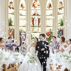 【ステンドグラス大聖堂】街行く人々の視線を集める高さ28mを誇る大聖堂がリニューアル。由緒あるステンドグラスが彩るチャペルで憧れの誓いを。大階段でのフラワーシャワー体験で花嫁のイメージを膨らませて。