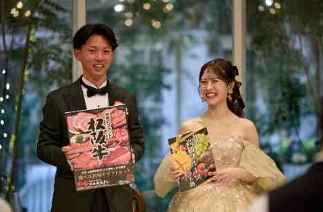 ゲストの皆様に心から楽しんでほしいという想いから、おふたりが用意されたのはゲスト参加型のプレゼントクイズ。正解が発表された瞬間、会場内には歓声と驚きの笑顔が広がりました。当選された方へおふたりから直接プレゼントが手渡されると、会場の盛り上がりは最高潮に。ゲスト一人ひとりの喜ぶ顔を思い浮かべて準備された演出は、おふたりの優しさが伝わる、笑顔あふれる賑やかなひとときとなりました。