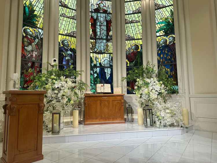 式場はホワイトを基調としていてとても明るい印象を受けた。チャペルの明るさについて、見学時が最大の光量と言われもっと明るい方がいいなと思った