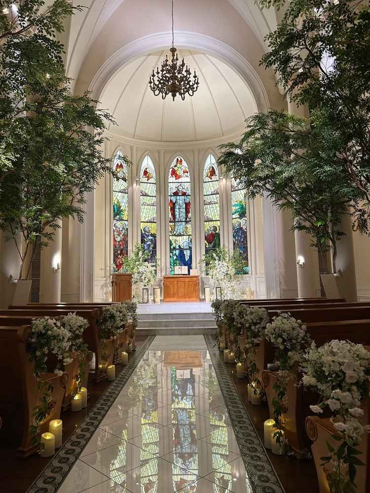 幻想的なチャペルは長いバージンロードとパイプオルガン、何よりもステンドグラスに圧巻でした。披露宴会場はすでに可愛らしく、お花などの追加でより可愛くなりそうと思いました。