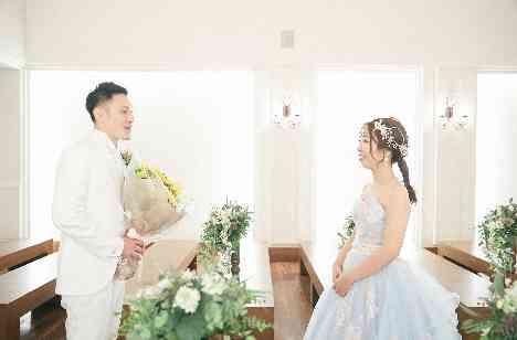 パーティ中には大きなスプーンを使ってファーストバイトを行っていただいたり、各テーブルを回りながら光の演出をしていただいたりと、ゲストにもサプライズを忘れないおふたり。そんな中新郎様は大切な新婦様へのサプライズもご準備いただきました。パーティのお開き後、新婦様の好きなひまわりのブーケを持ってチャペルにご登場!新婦様も思わずびっくりの演出となりました。