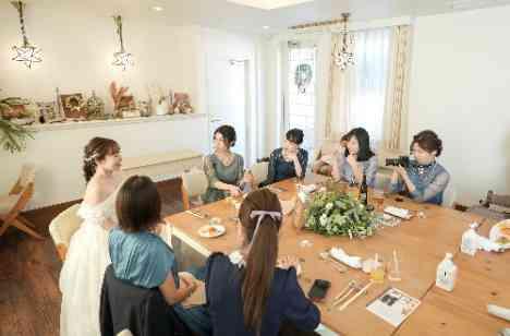 『white × green × natural』の柔らかい色合いの空間に、新郎新婦様とゲスト様が顔を合わせて過ごせるテーブルコーディネートにてお迎えしました。 間接照明や自然光が差し込み邸宅を感じられる会場で会食を楽しまれておりました.** 友人様と新婦様が座って、ゆっくりお話できるのも会食ならではのシーンです!