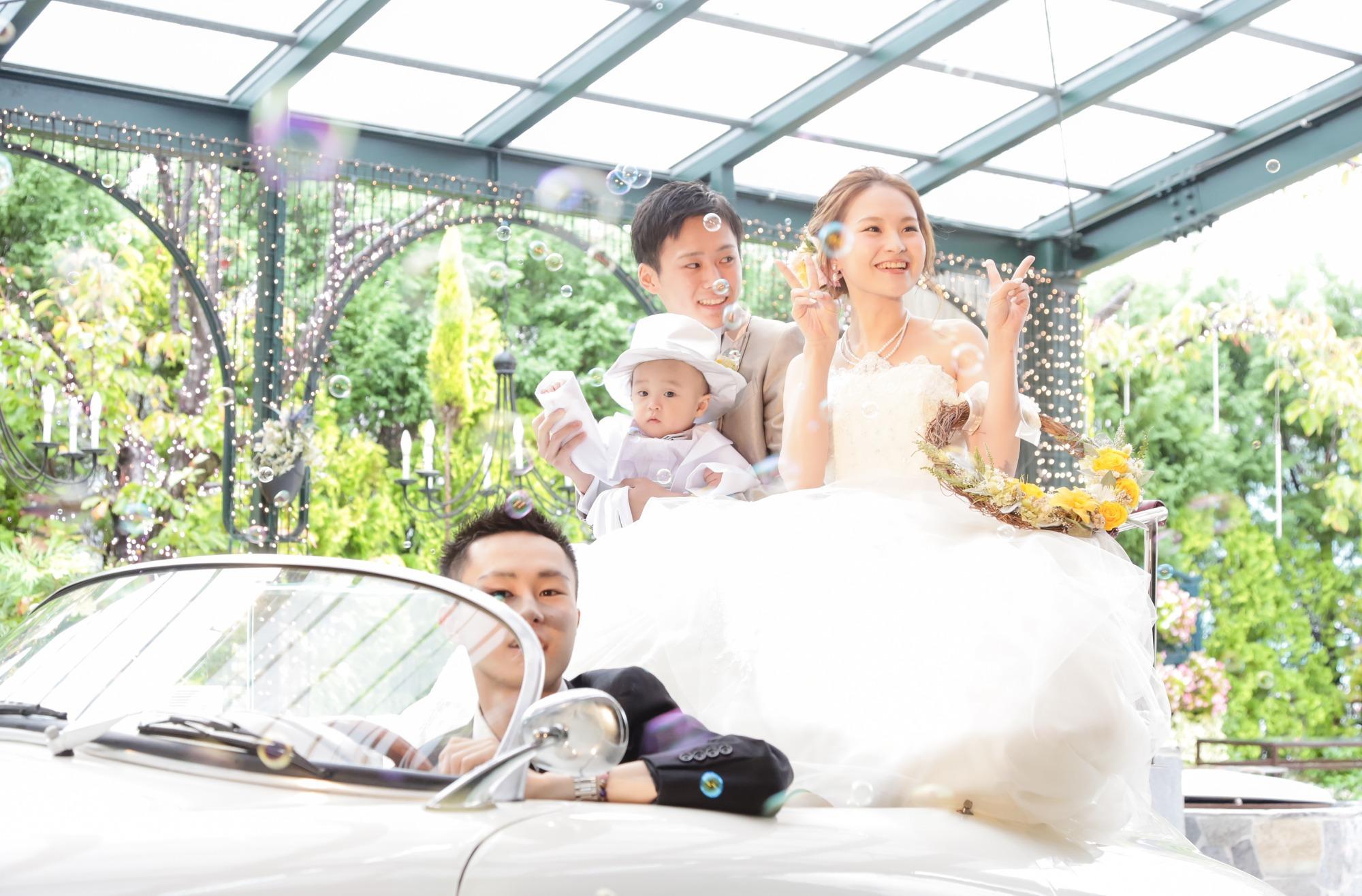 音楽が流れ会場内が暗くなると・・・ガーデンから登場する新郎新婦様が乗ってきたのは、ゲスト様が運転するオープンカー♪突然のサプライズ登場で会場内は歓声で大盛り上がり!!笑いとサプライズにつつまれる中、パーティのスタートです♪