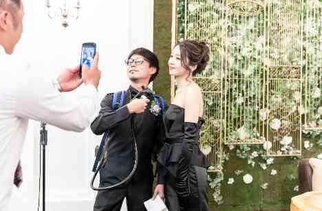 「あなた以外には染まりません」という意味がこめられたブラックドレス✧ブラックドレスに合わせてタキシードもオーダーメイドでコーディネートをされました! ご成約前からブラックドレスを強くご希望されており、特別におふたりでご用意されました。ゲストのみなさまにたくさんカメラを向けられてノリノリのおふたりでした♡