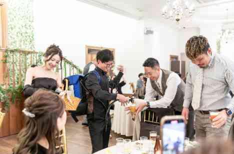 再入場演出として新郎様はビールサーバーを背負って、新婦様はおつまみをたくさん持って登場しました。 演出を通してゲストのみなさまと触れ合える時間を過ごされました!ゲストの方も直接新郎新婦様とふれあいのお時間を取ることができ、「楽しかった」と嬉しいお声もいただきました♫ ザ・ジョージアンテラスでは大切なゲストとのふれあいのお時間も大切にしています◎