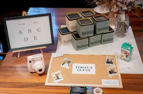 受付ではゲストのみなさまにチェキでお写真撮影いただけるよう設置されました。ご家族やご友人も順に楽しそうに撮影されておりました♡ コルクボードにいっぱいになったコルクボードを見て嬉しそうにされる新郎新婦様でした♪ また、待合スペースにはスタイニーボトルもご用意され、挙式前もドリンクを楽しんでいただきました✧˖°
