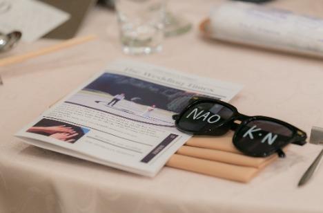 テーブルコーディネートには、おふたり手作りのプロフィールブックと、席札としてゲストのイニシャル入りサングラスをご用意!おもてなしの気持ちが込められた世界にひとつだけのアイテムに、ゲストからも笑顔がこぼれます。パーティ中には実際にサングラスをかけて写真撮影を楽しむなど、会場全体が一体となって盛り上がる、思い出に残る演出となりました✧˖°