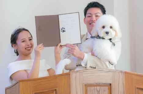 挙式では、おふたりの愛犬がリングドッグとして登場し、大切な結婚指輪をしっかりとお届け♡ ご署名のシーンでは、肉球スタンプで愛犬も参加し、3人で愛を誓い合いました。大切なゲストに見守られながら進んだセレモニーは、笑顔と感動に包まれた心温まるひとときに。家族の絆を感じる、忘れられない大切な瞬間となりました。