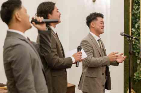 ご新郎様友人代表によるスピーチのあと、続けてご友人2名が登場し、友人3名でのサプライズがスタート! おふたりのために考えてくださった「純恋歌」を心を込めて歌ってくださいました。 想いの詰まった歌声に、会場は自然とひとつに! 笑顔や感動が広がる中、改めておふたりが多くの人に愛されていることを感じられる、かけがえのない大切な時間となりました✧˖°