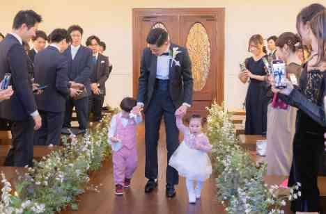 リングボーイ・リングガールは、おふたりのお子様が務めてくれました♡ リハーサルでは、緊張のあまり動けなくなってしまったお兄ちゃん。一方で妹ちゃんは、しっかりと前まで歩いてくれる頼もしい姿も! 本番はどうなるかなと見守る中、結果はおふたりの予想通り、1歩も動けずご新郎様がお迎えに行く微笑ましい展開に! 最後は3人で想いのこもった指輪を届け、家族ならではの温かくて可愛い思い出のワンシーンに✧˖°