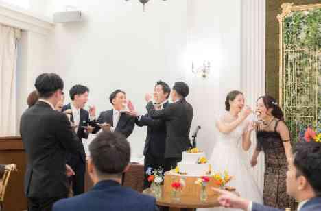 ご披露宴でもたくさんの方に楽しんでいただけるよう、さまざまな演出を試行錯誤!できるだけ多くの方に役割が行き渡るようにと考えられた中で行われたサンクスバイトは、なんと新郎様側は大学時代のご友人6名をお呼びするサプライズに! リレー形式で順番にケーキを頬張る姿に、会場は笑顔と歓声に包まれました。 感謝の気持ちがしっかりと伝わる、忘れられない楽しいひとときとなりました✧˖°
